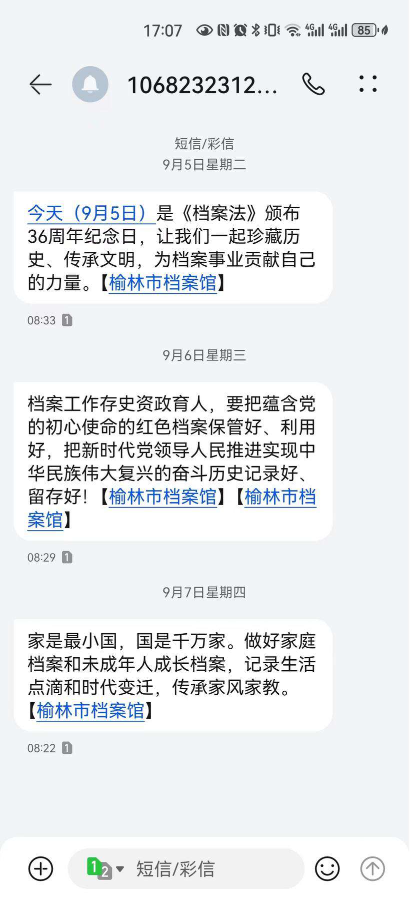 二是在9月5日至7日三天,面向全市人民分别发送关于纪念《档案法》颁布、习近平总书记关于档案工作重要批示及建立家庭档案及未成年人成长档案方面的宣传短信,共计10万条,广泛宣传档案知识,扩大档案工作影响力。